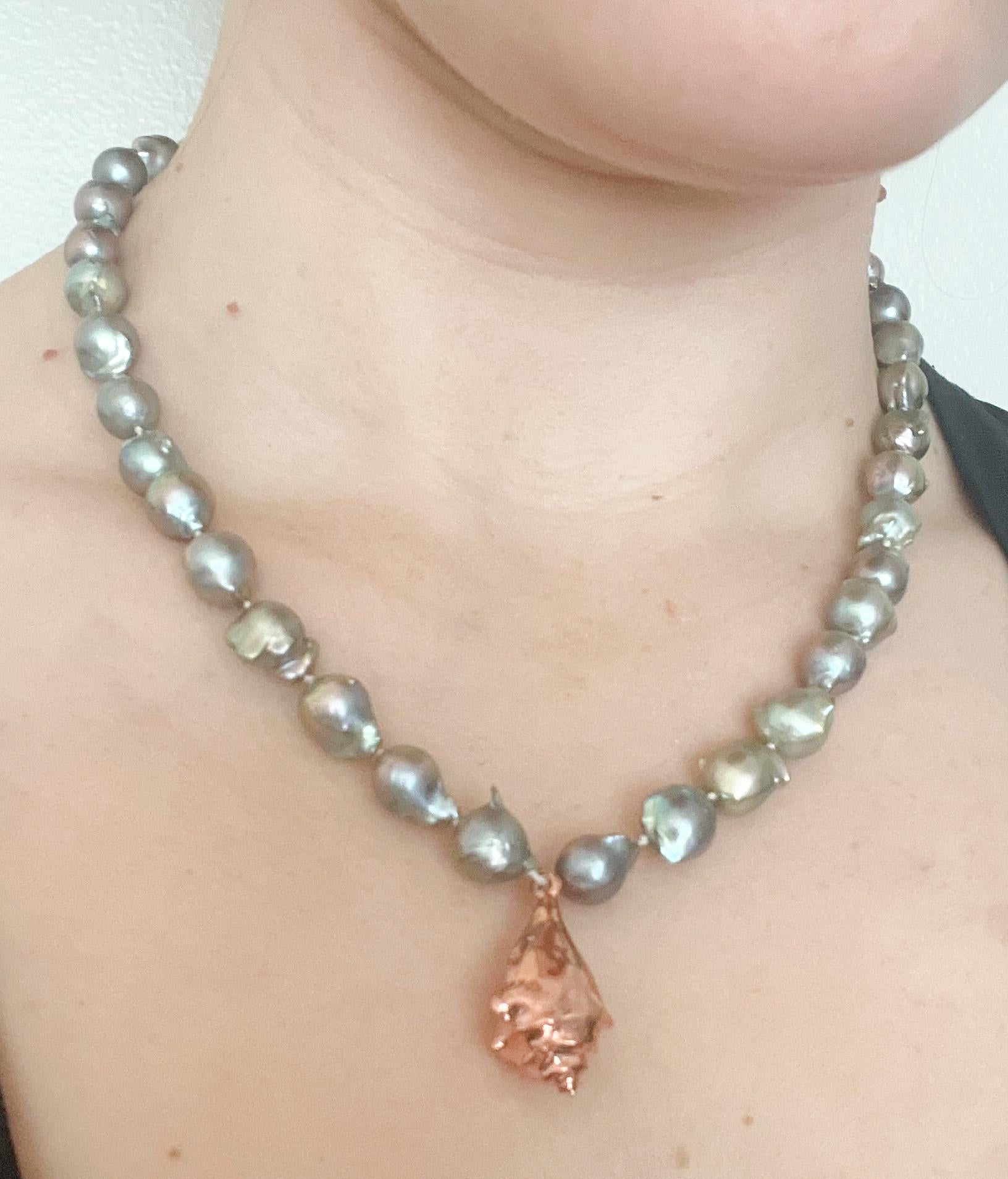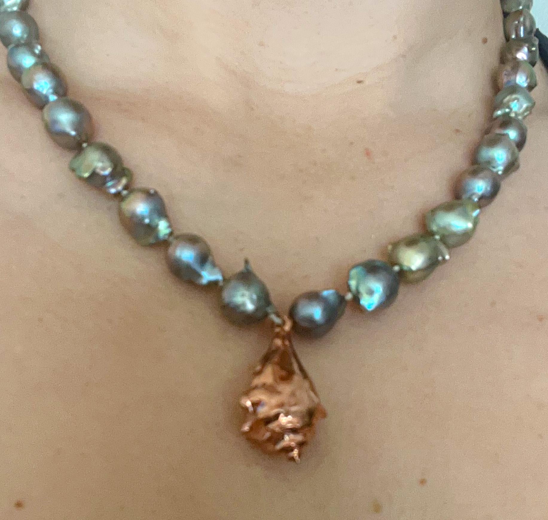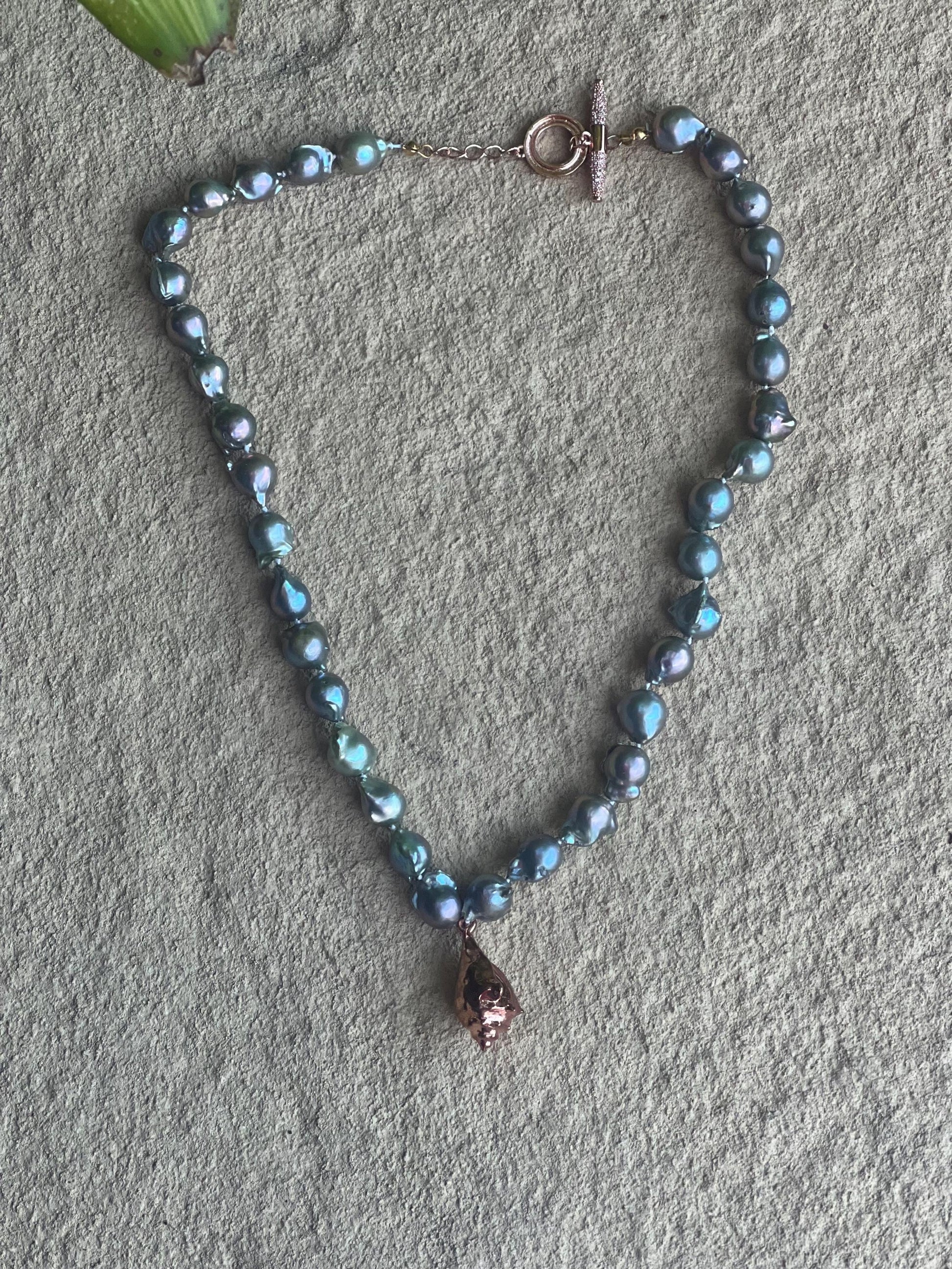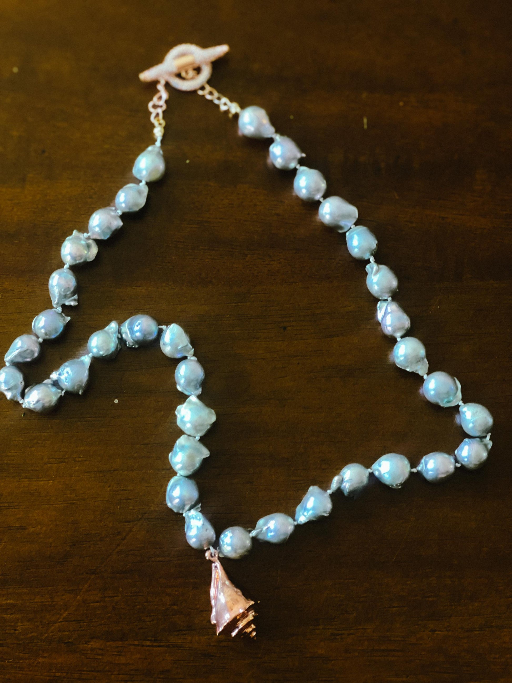 Freshwater baroque storm cloud pearl 9-10mm in size hand double strung and knotted for the strongest necklace and to protect your pearls. Toggle clasp on a 16” choker with 18k rose gold plated hand designed charm. Rose gold toggle clasp.