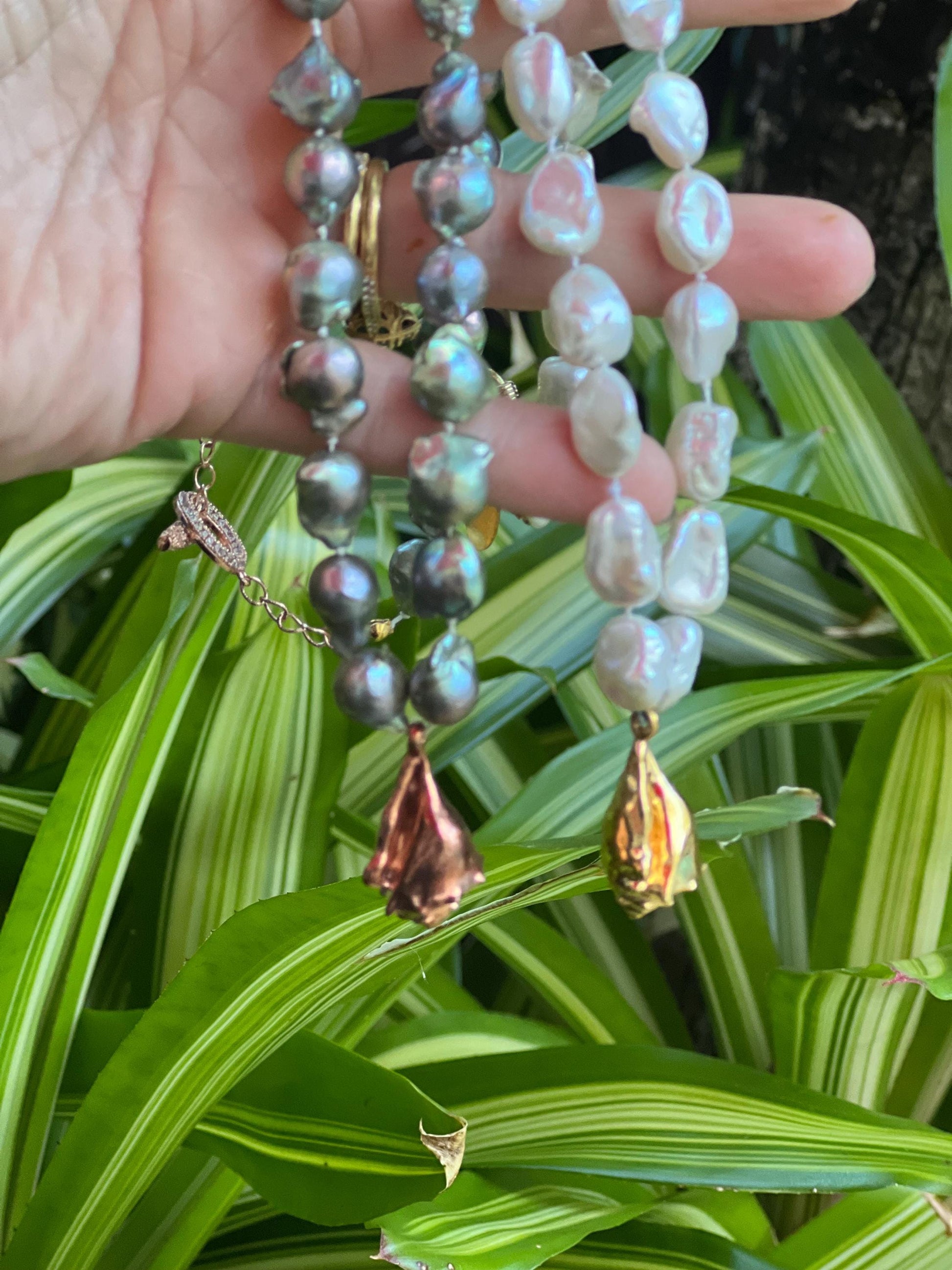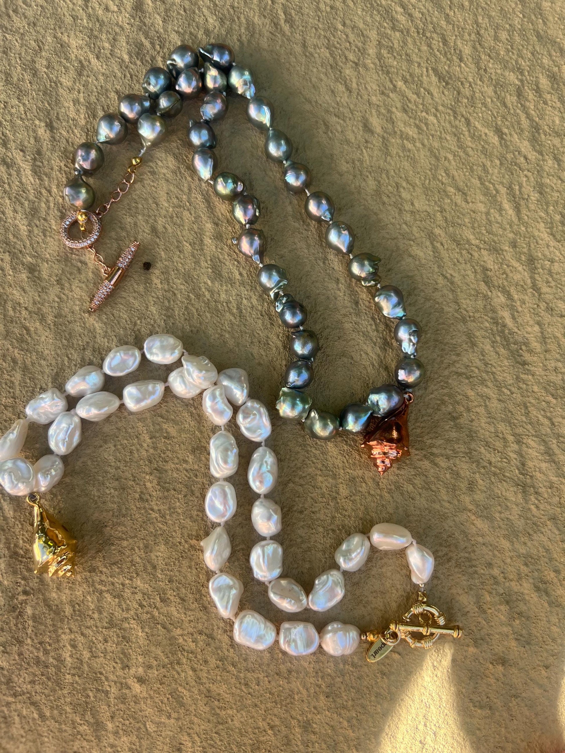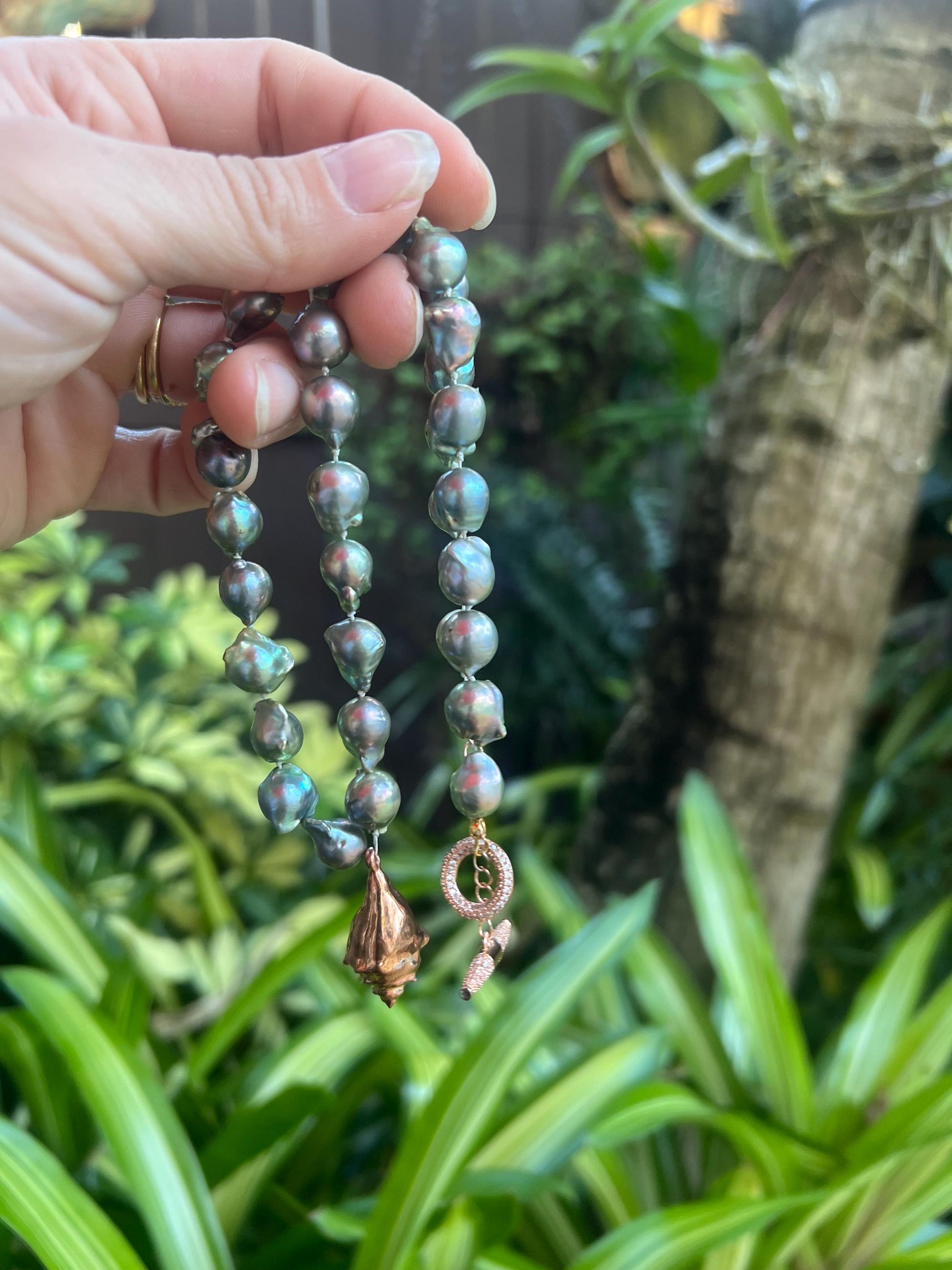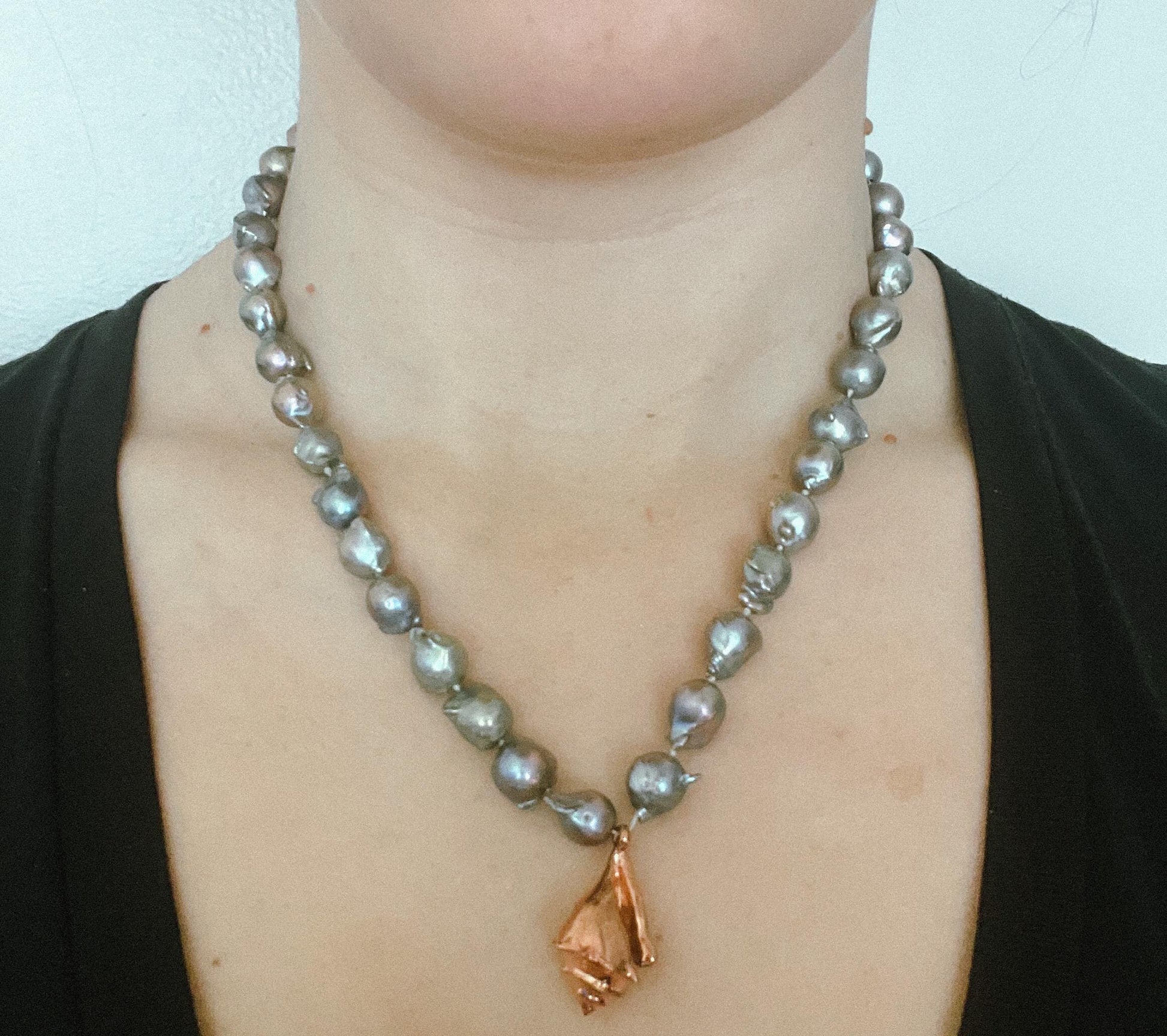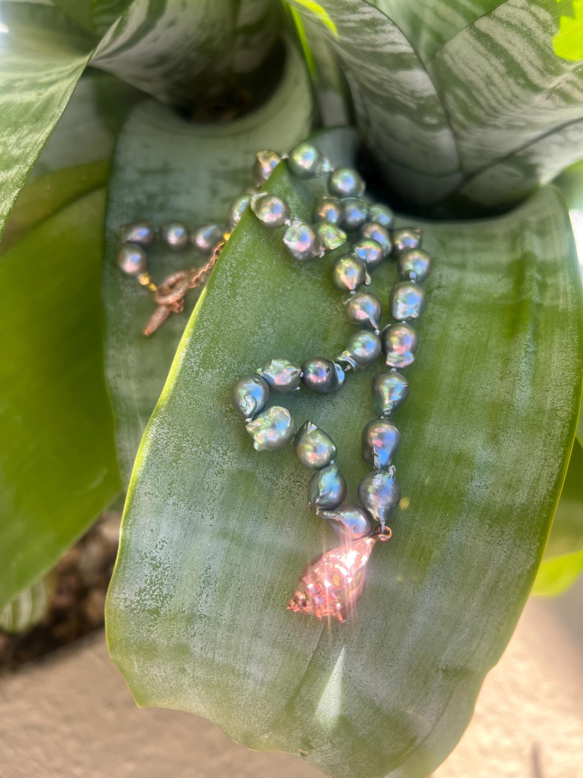 Freshwater baroque storm cloud pearl 9-10mm in size hand double strung and knotted for the strongest necklace and to protect your pearls. Toggle clasp on a 16” choker with 18k rose gold plated hand designed charm. Rose gold toggle clasp.
