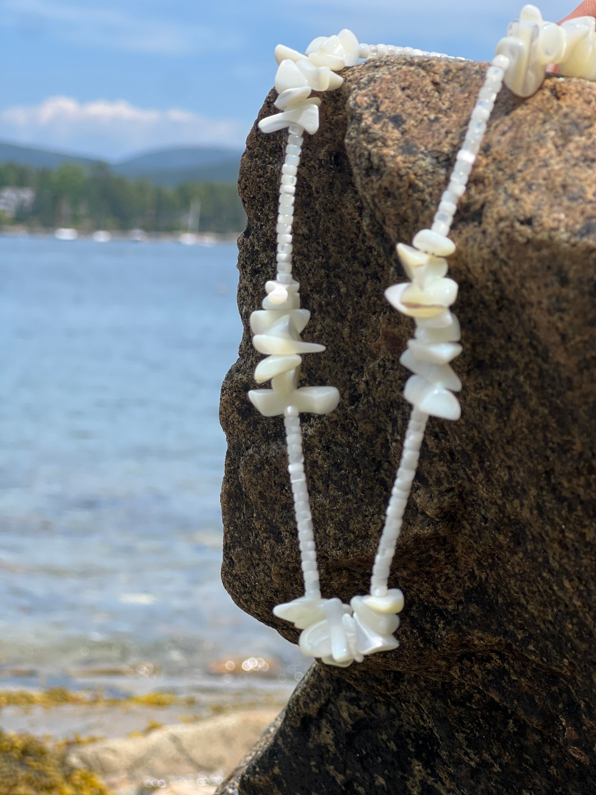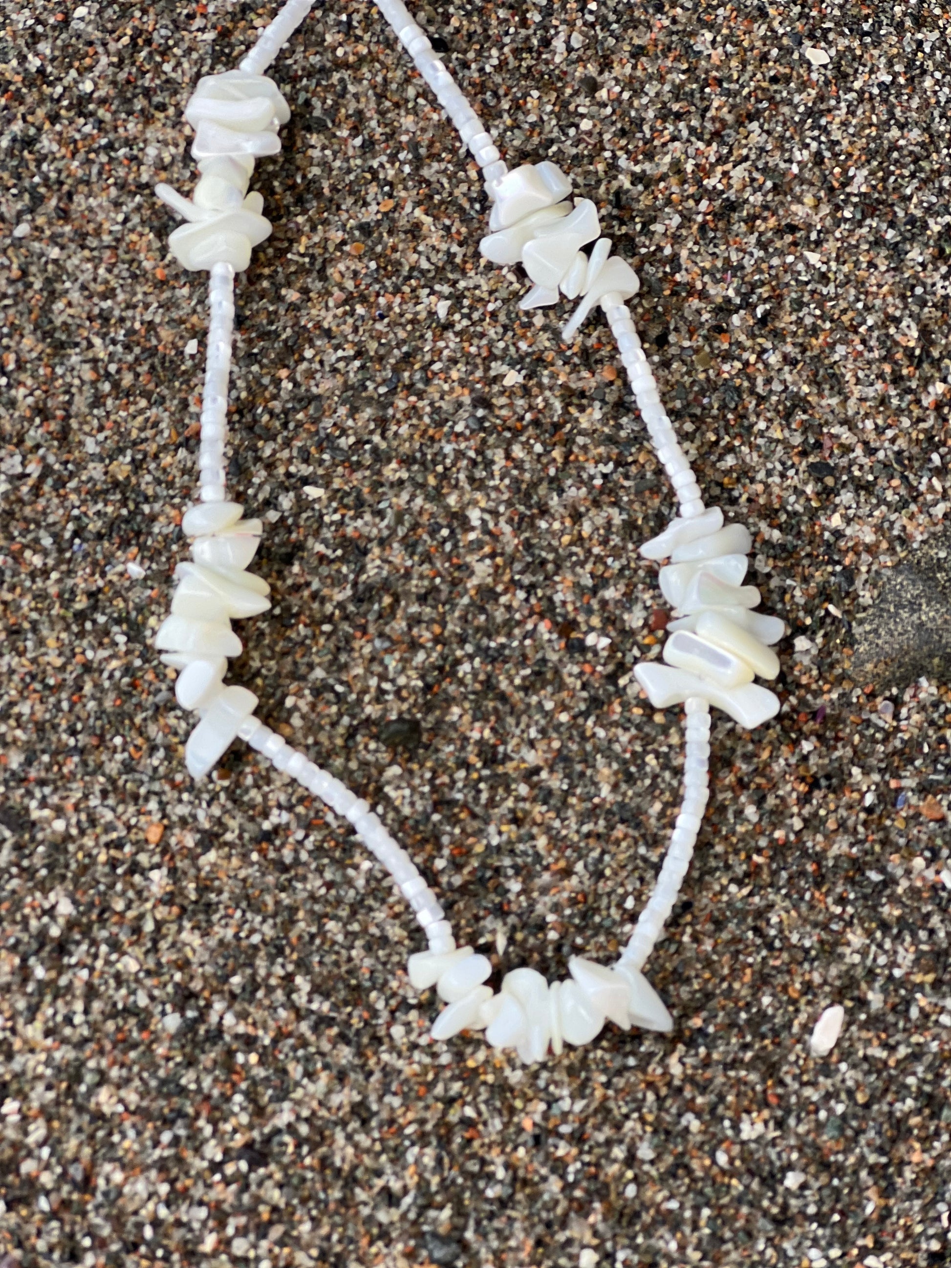 Mother of pearl shell beads with white mother of pearl chips. 17 inches with a gold filled lobster clasp