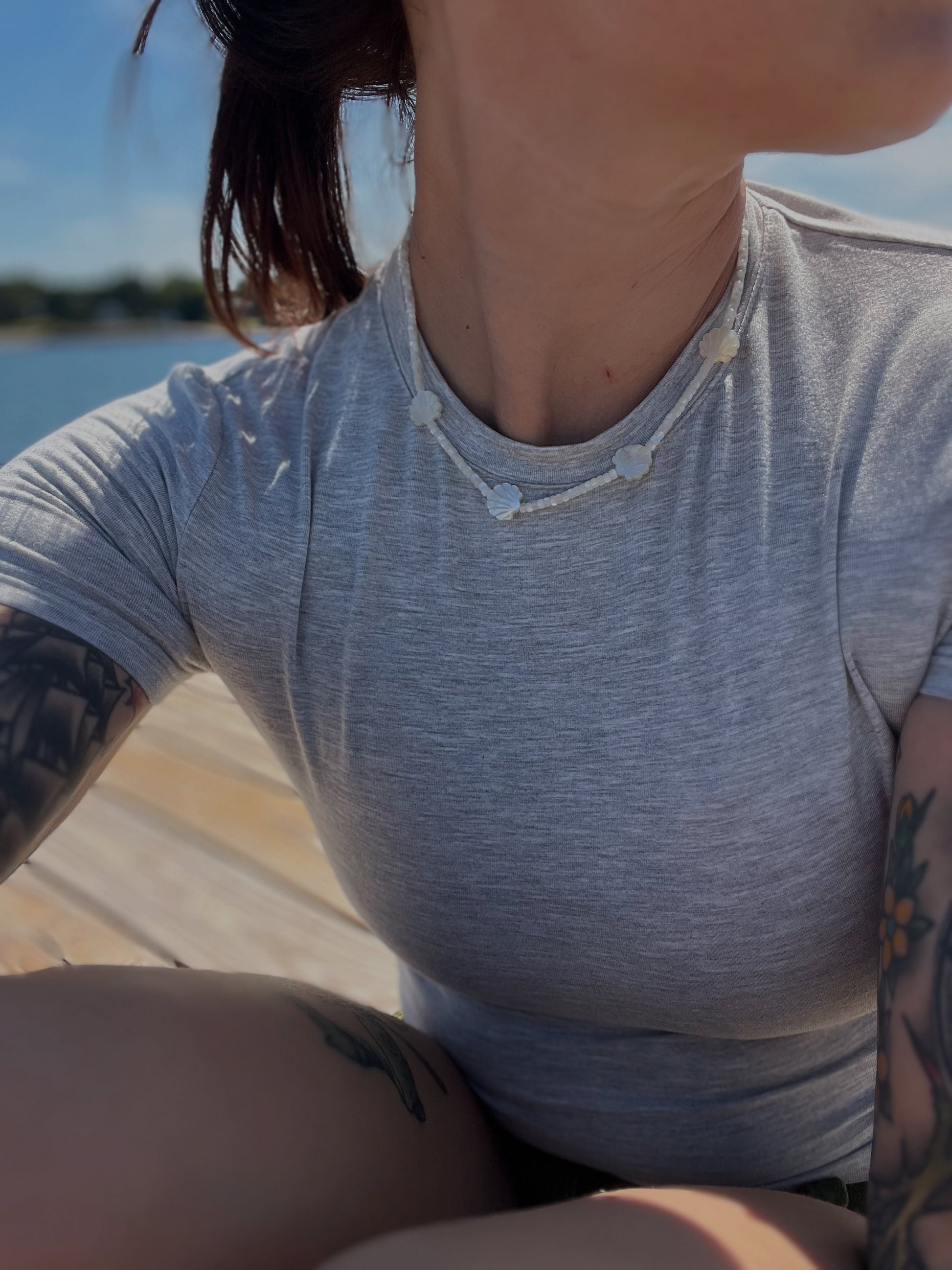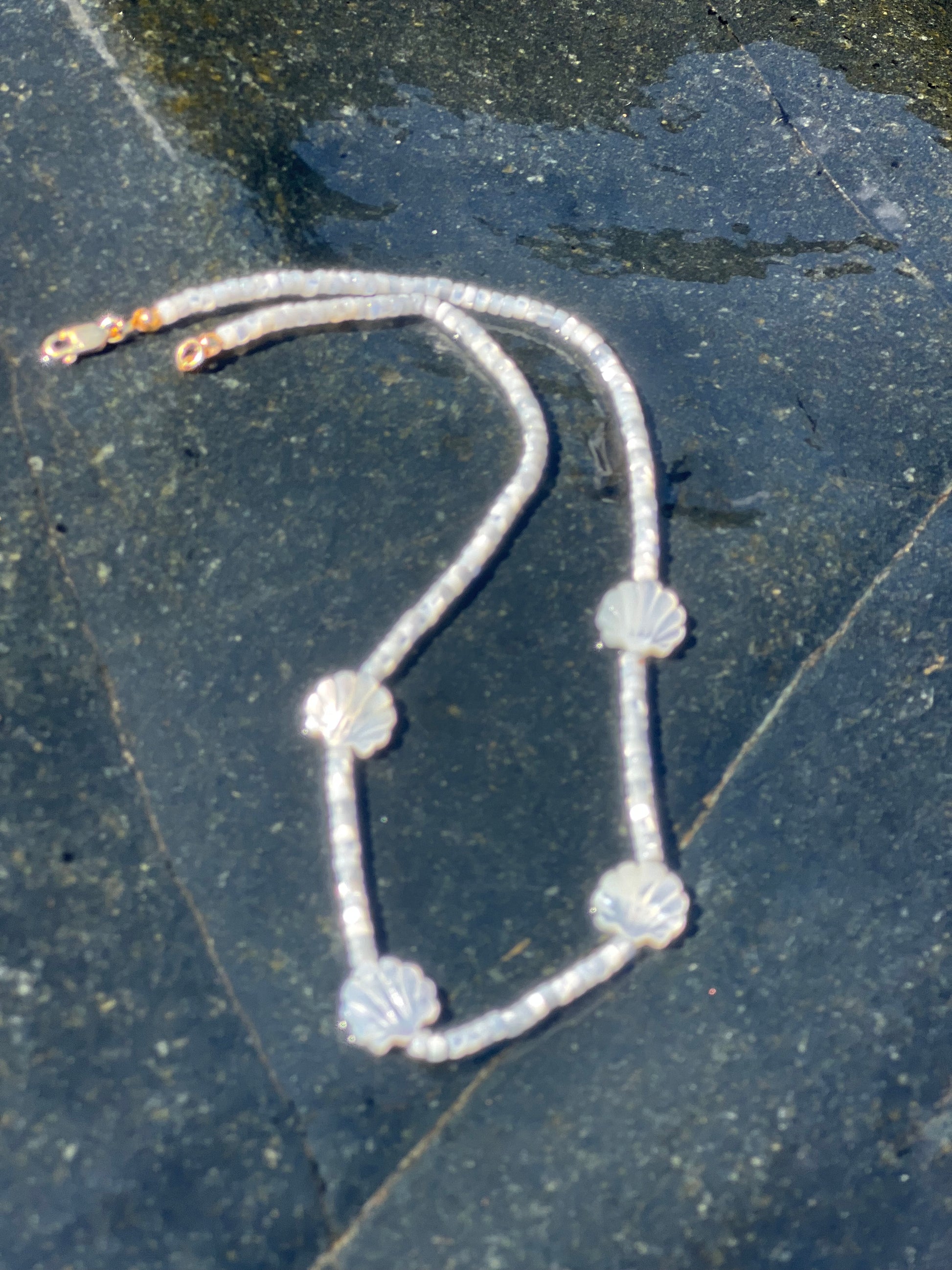 Mother of pearl tiny beaded choker with mother of pearl shells inlayed throughout. Glistens with white and opal tones and can be layered with longer or chunkier pieces. 14k gold lobster clasp.