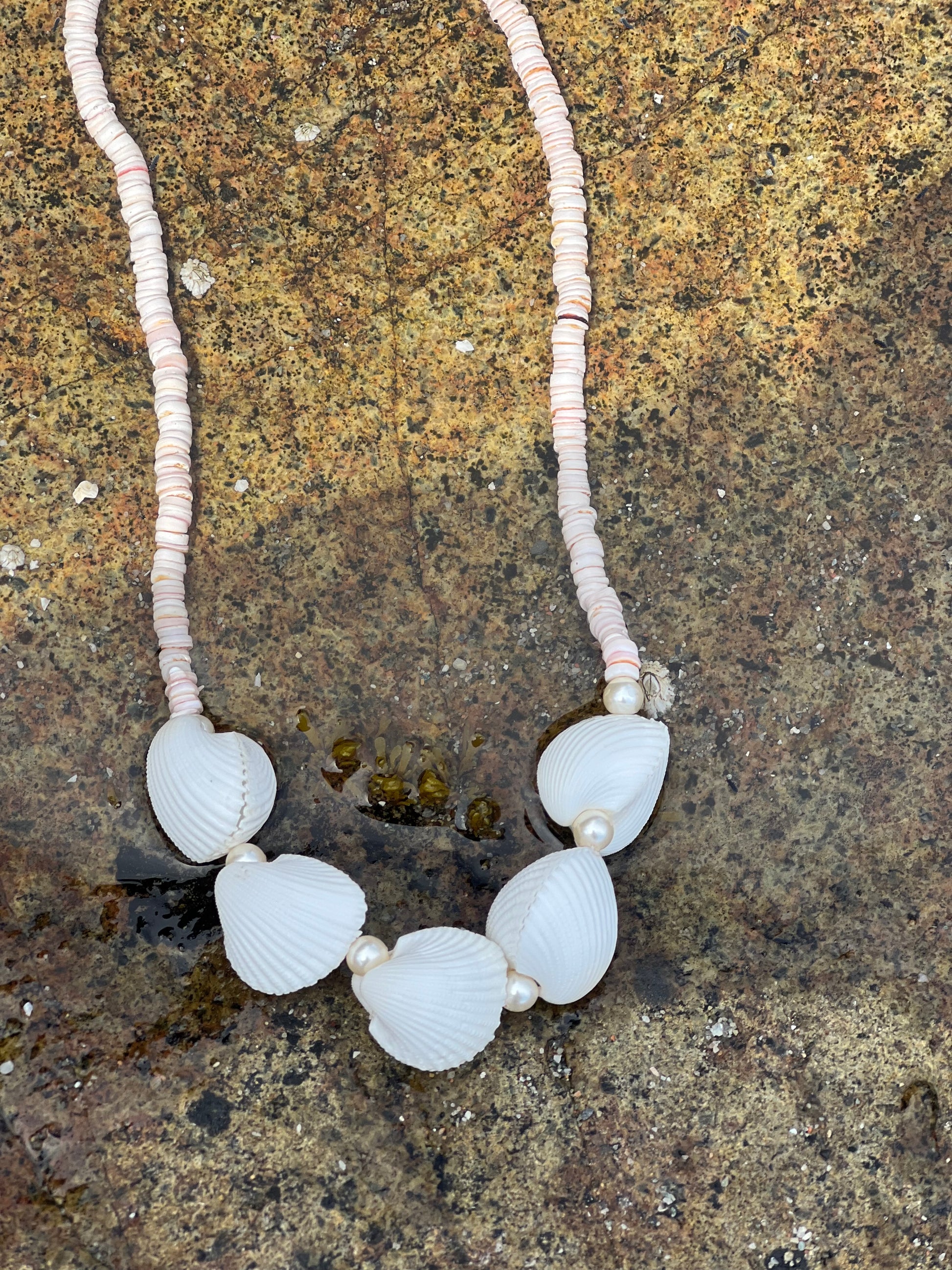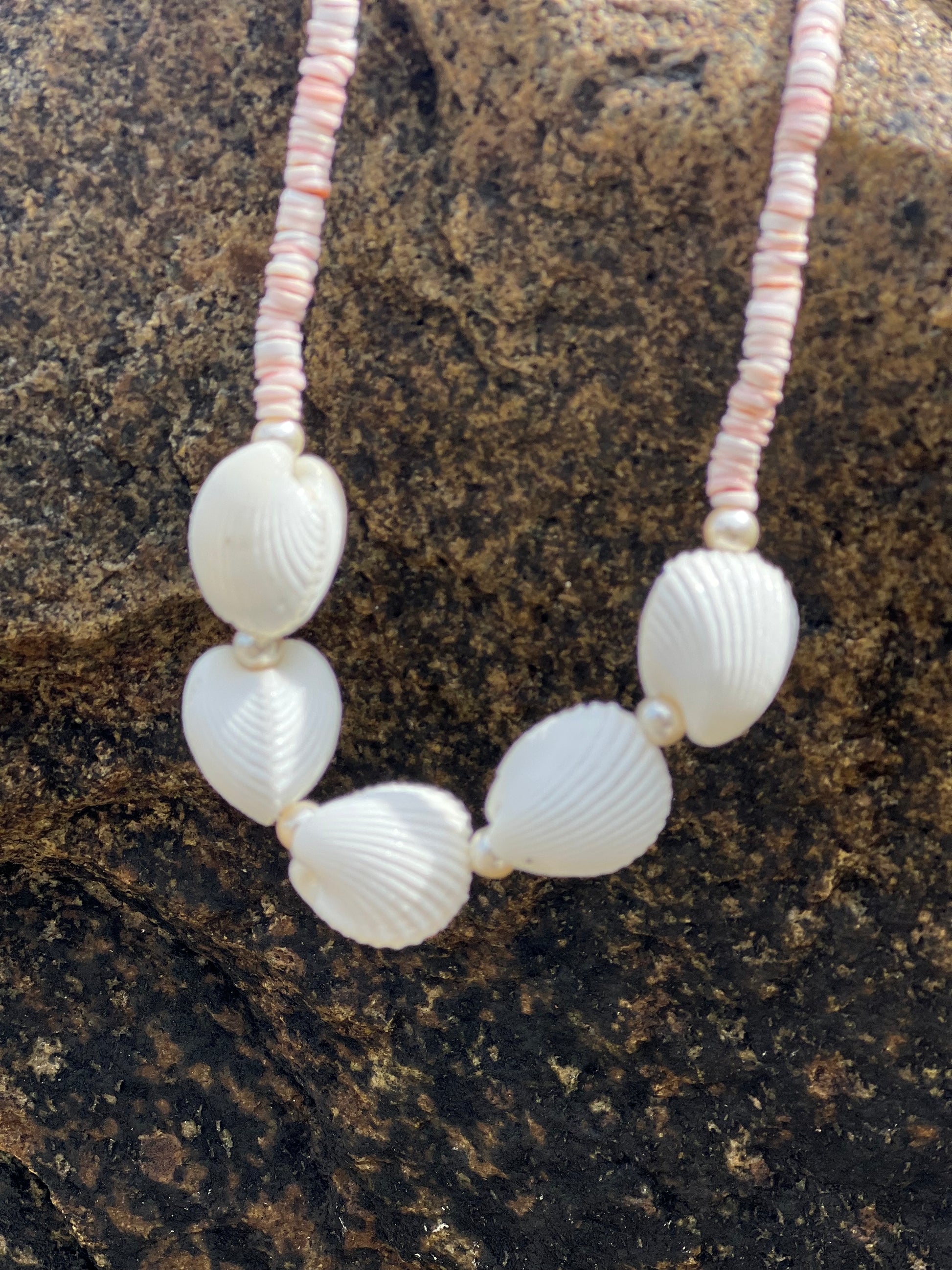 Conch shell beads with white clam shells and pearls centered. 17 inches with a gold filled lobster clasp.
