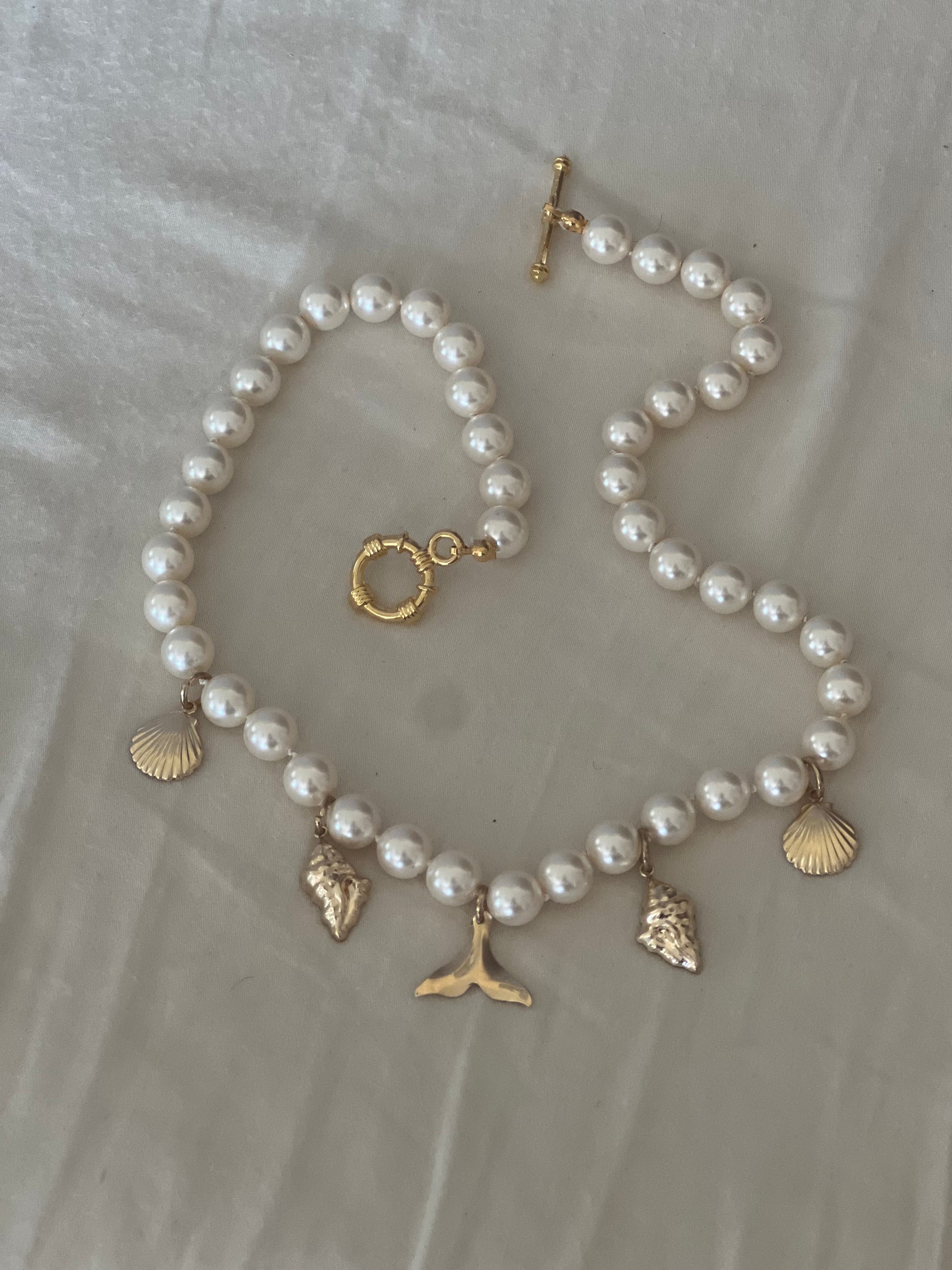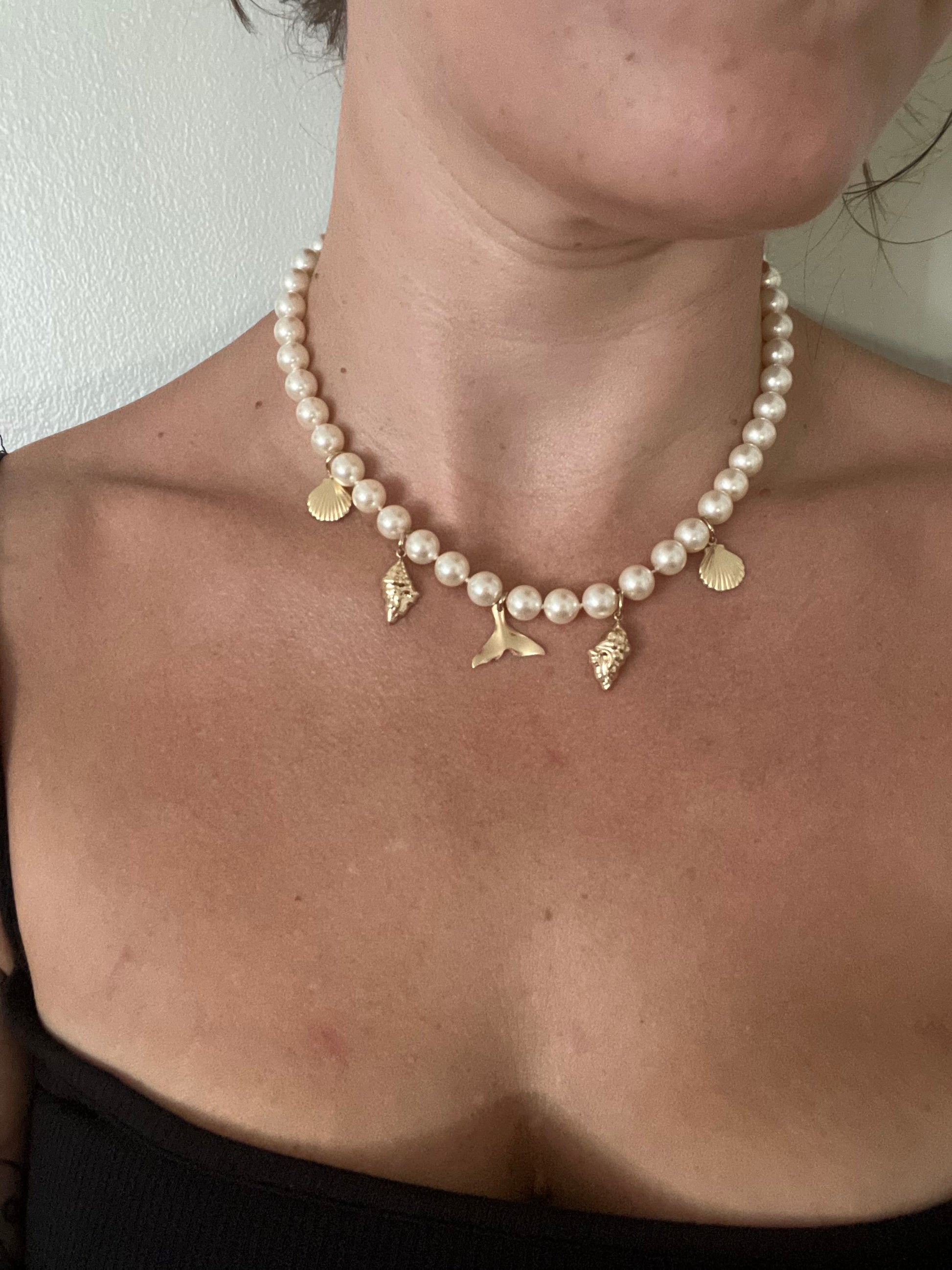 8mm round pearl choker with toggle clasp and 18k gold charms