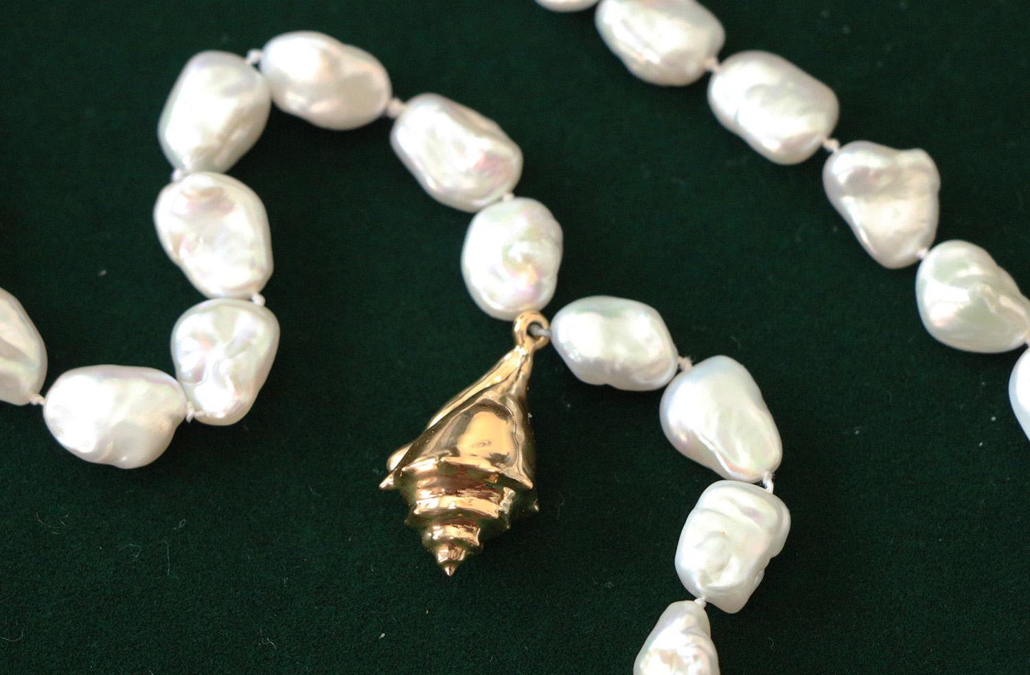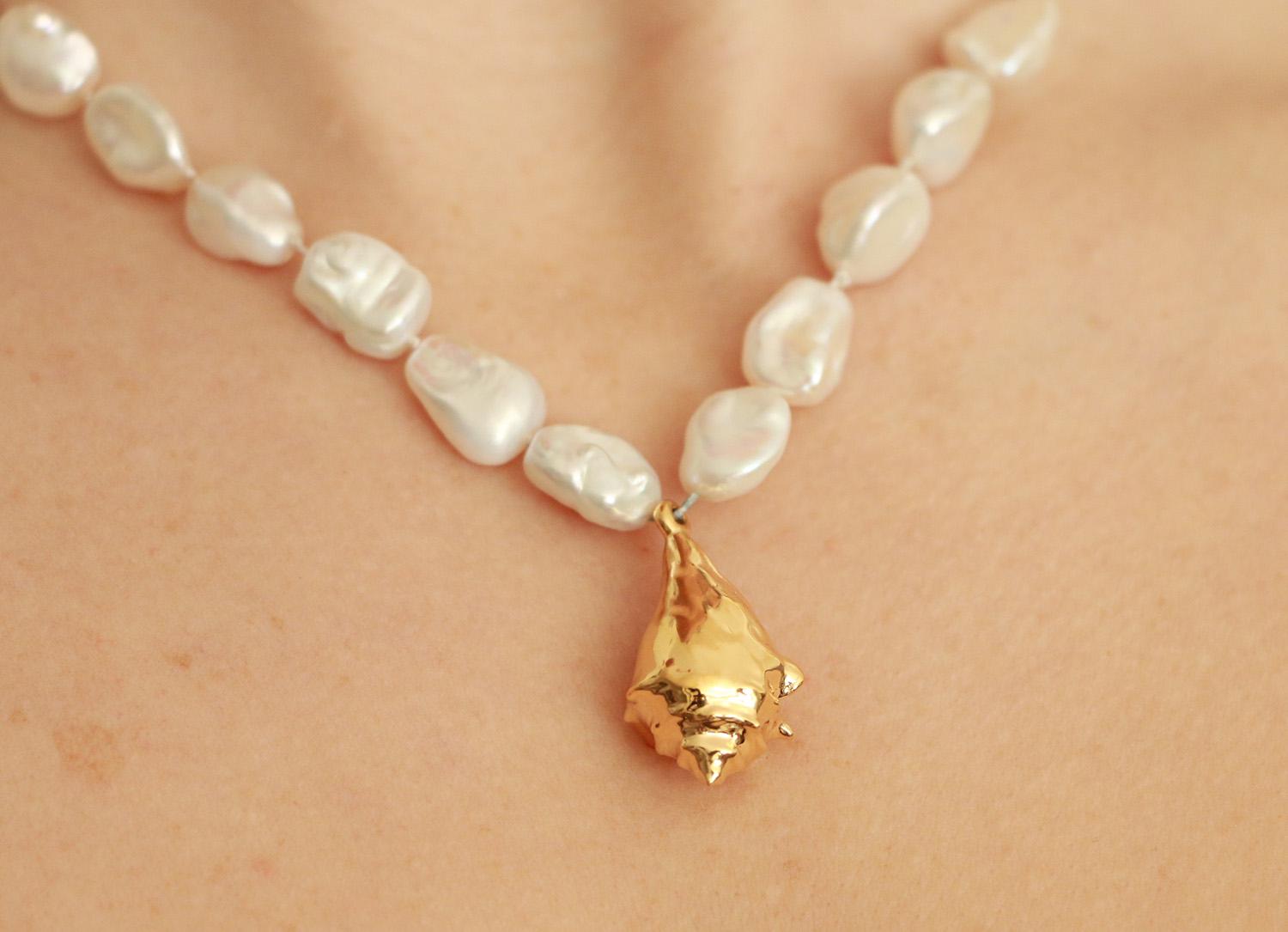 Freshwater baroque pearl 9-10mm in size hand double strung and knotted for the strongest necklace and to protect your pearls. Toggle clasp on a 16” choker with 18k gold plated hand designed charm. Hypoallergenic and wear resistant.